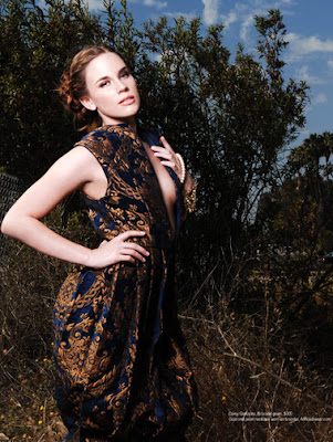 The hot new ABC show REVENGE is sure to be a hit and co-stars the up and coming young starlet Christa B Allen. Recently this beauty came to shoot with us and looks amazing in the current issue. She looks cool and confident in a great shot on a deserted country road in a fabulous brocade dress by the incredibly talented Daisy Gonzalez,. I love the dress and I love the richness of brocades. This fabric can be a bit heavy and much embellished. It can be hard to make them look cool and fresh. Here are a few outfit ideas, as brocades are going to be huge this winter, to get you started early……..